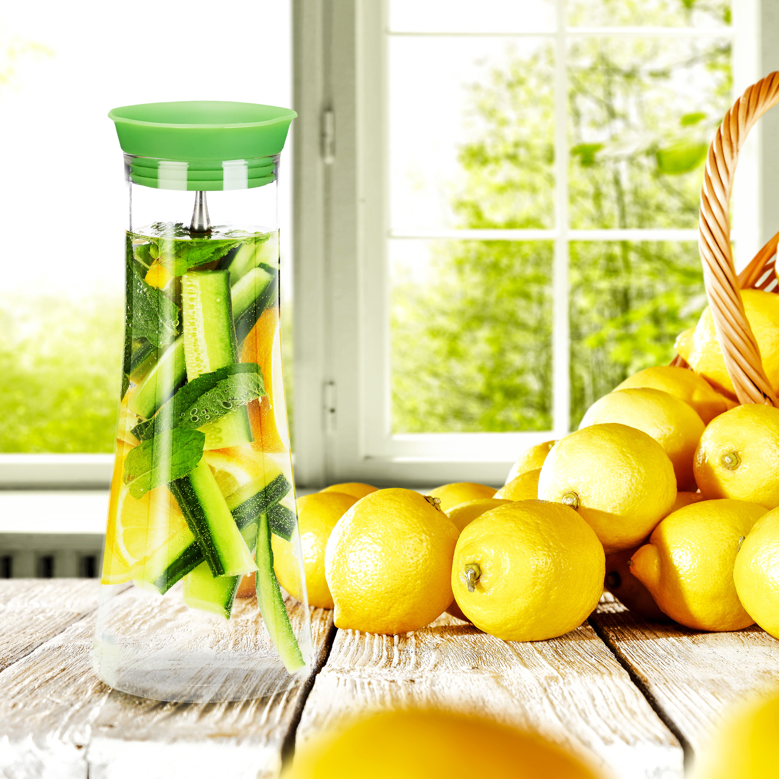Doch nicht nur optisch weiß die Trinkkaraffe zu überzeugen - der dichte Edelstahl-Deckel mit Siebeinsatz filtert Obst und Früchte beim Eingießen heraus und ermöglicht das Ausschenken der Getränke in jeder Richtung.