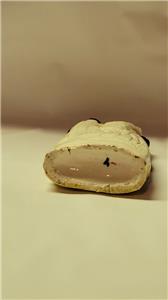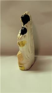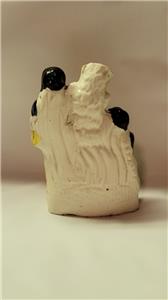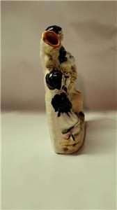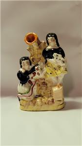 Antique Staffordshire flat back spill vase with two Ladies, one is holding a Spaniel dog and the other is holding a white rabbit. The base is rough around the bottom edge that appears to be original to the piece as it is glazed and there is overall light crazing. There is a spot on the back that looks like the glaze is trying to flake off and there are a couple rough spots around the opening of the vase. Measures 3 1/2" wide, 5 1/2" tall and has a blue mark as well as a red mark on the bottom.