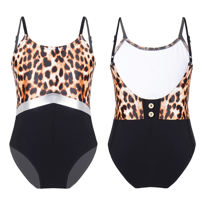 Kids Girls Adjustable Straps Sleeveless Open Back Leopard Print swimming Jumpsuit.