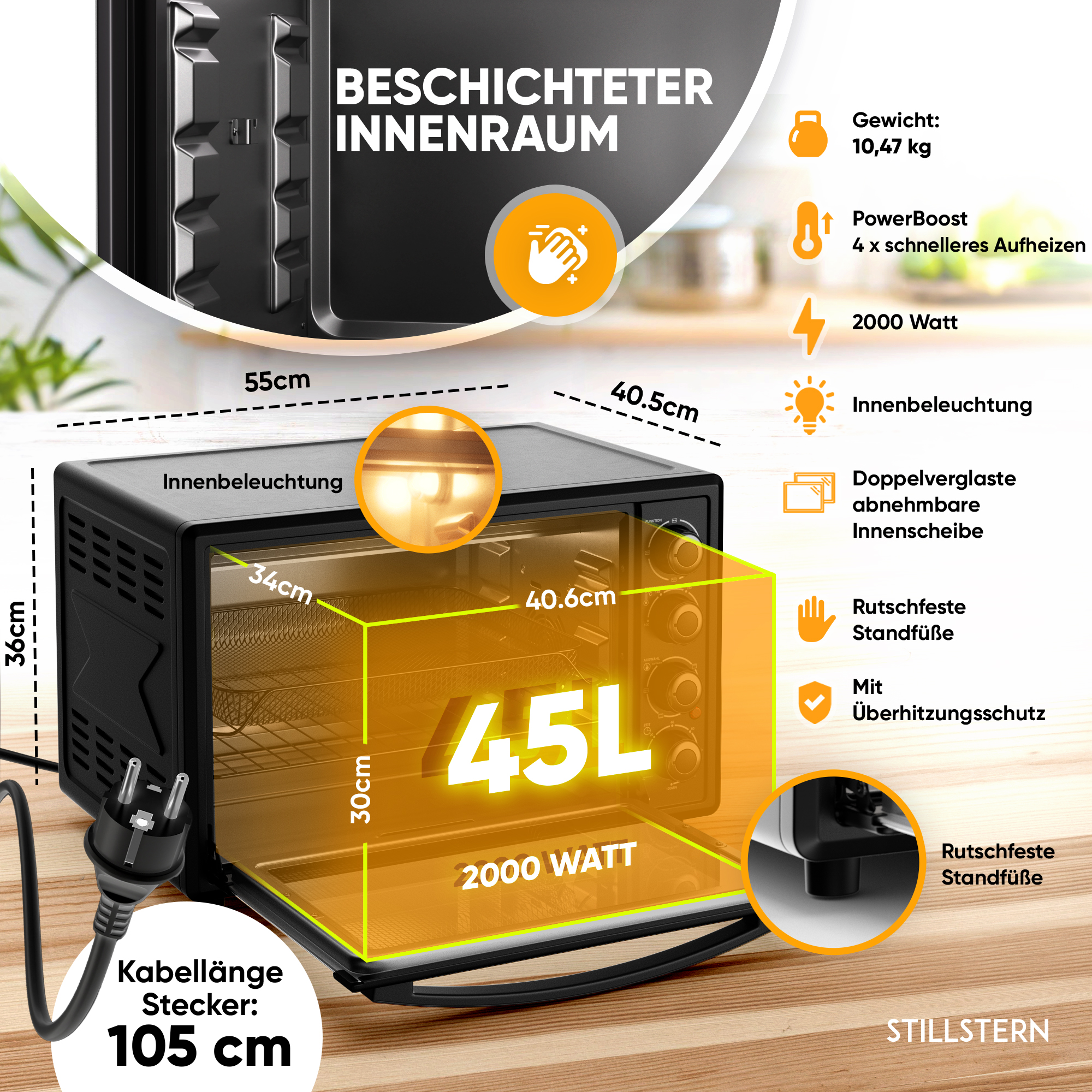 • Standfüße mit rutschhemmenden Gummipads