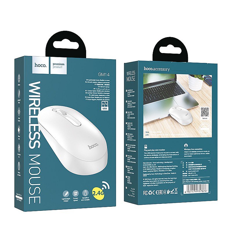HOCO Kabellose Wireless Maus Platinium 2.4G Business PC-Maus weiß GM14 HOCO GM14 Kabellose Maus Modell: HOCO Platinium GM14 Material: ABS Größe: 115 x 63 x 36 mm Gewicht: 60 g Chip: MX8650 Verbindungsmodus: 2,4 G drahtlose Verbindung DPI: 1200 Lebensdauer: 3.000.000 Schaltklick-Lebensdauer, 200.000 Scrollen. Schaltflächentyp: 3D-Schaltfläche Kompatibel mit den meisten Desktops und Laptops mit USB-Anschluss.