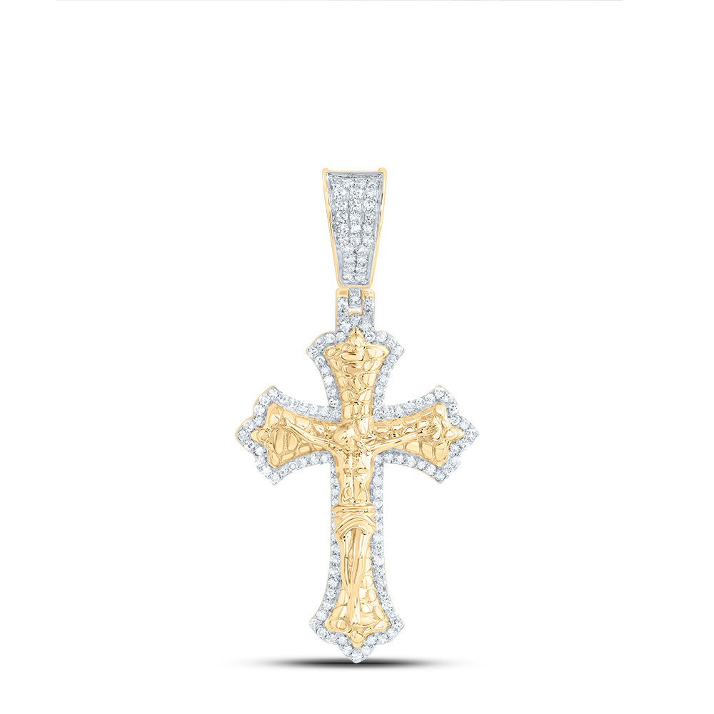 (4.4 gr. of 10K Yellow Gold | Total Carat Weight: 0.37 ct. t.w. of White Diamonds | Length: 1.65" (Including Bail) | Width: 0.80" | Thickness: 5mm | Clarity: I1 - I2 | Color: H - I | Genuine Round Diamond Jesus / Yeshua Crucifix Pendant Statement Charm)