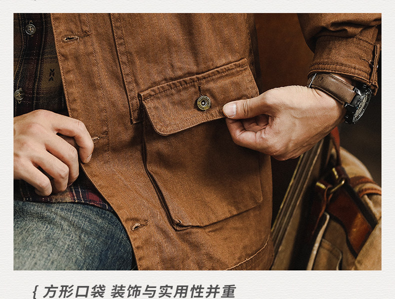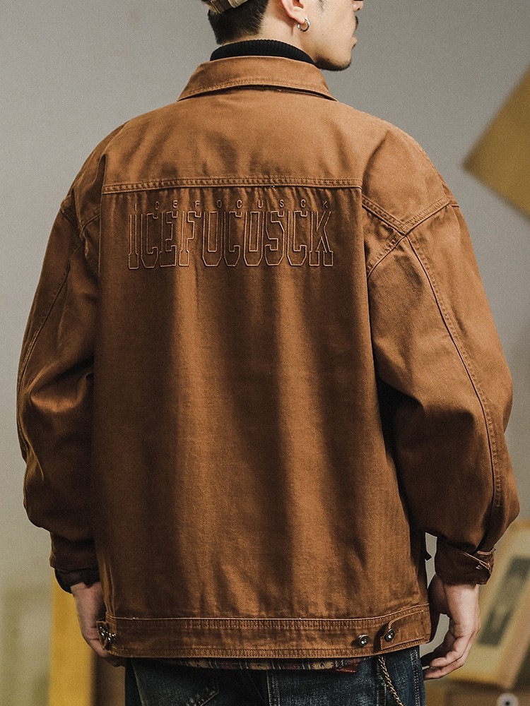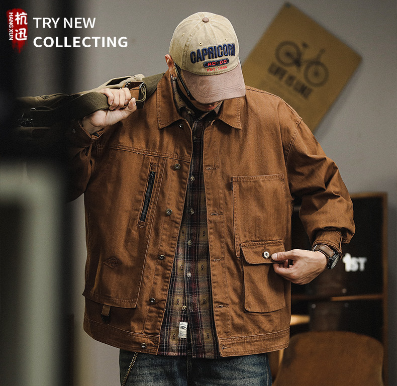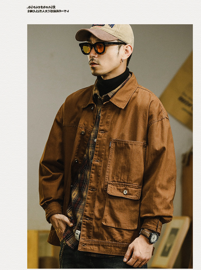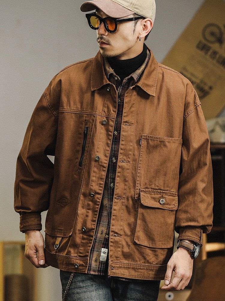 Retro Multi-pocket Work Jacket Mens Loose Cotton Hunting Denim Jacket Workwear