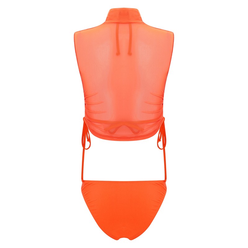 3-piece swimsuit set includes bikini bra, sheer mesh crop top and briefs. Triangle bra has removable chest pad, halter neck and lacing up ribbon.