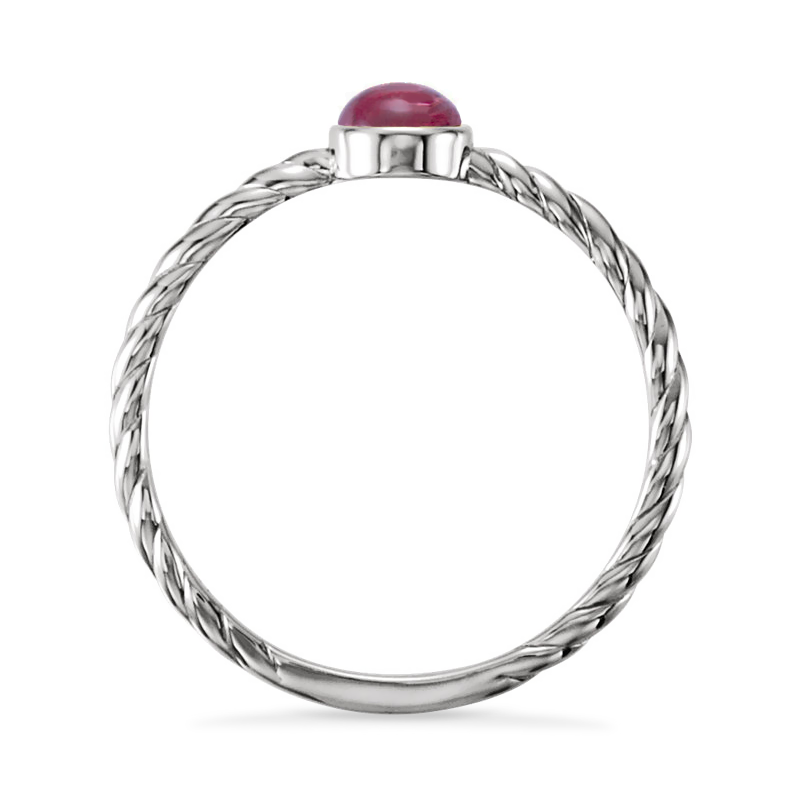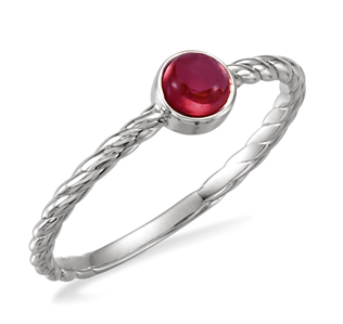 Such a pretty design on this .925 sterling silver and genuine cabochon garnet gemstone ring. The focal point of the design is a center 4mm round-cut red garnet cabochon solitaire gemstone set perfectly in a modern bezel setting. Deep red garnet gemstone is surrounded by a polished sterling silver band with a twisted rope detail. Well crafted ring has a .30ct garnet and just over 1 gram of sterling silver. Cabochon is a gemstone which has been shaped and polished as opposed to faceted.