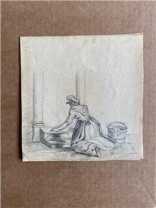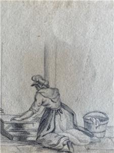 Victorian Simple Drawing of a Lady Scrubbing the Steps with bucket and cloth