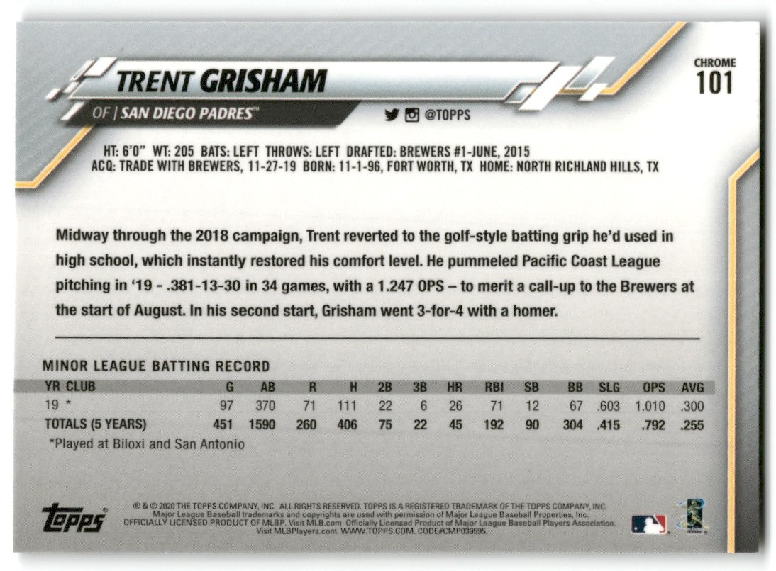 | 2020 Topps Chrome Trent Grisham #101 RC San Diego Padres |