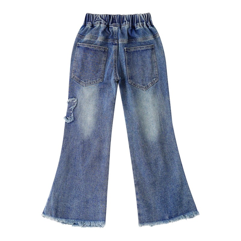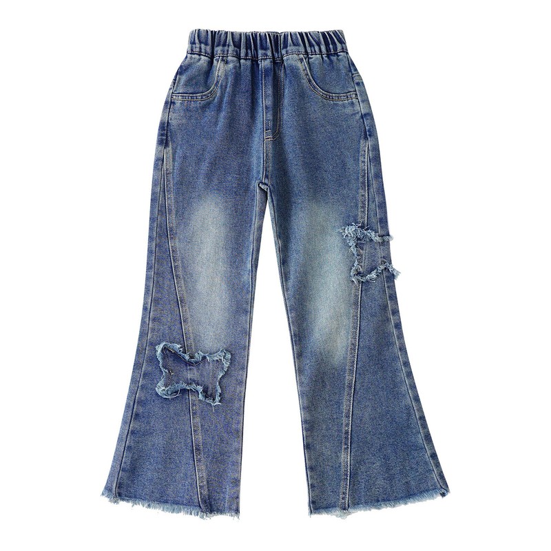 Girl’s jeans make your girl look cute and fashionable with butterfly pattern, frayed raw hem and bell-bottom design.
