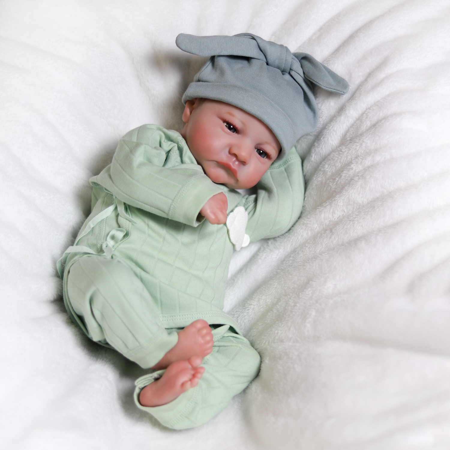 2.Joints of arms and legs are movable. The baby can sit, can lie down, can't standing, can't speaking,can't winking.