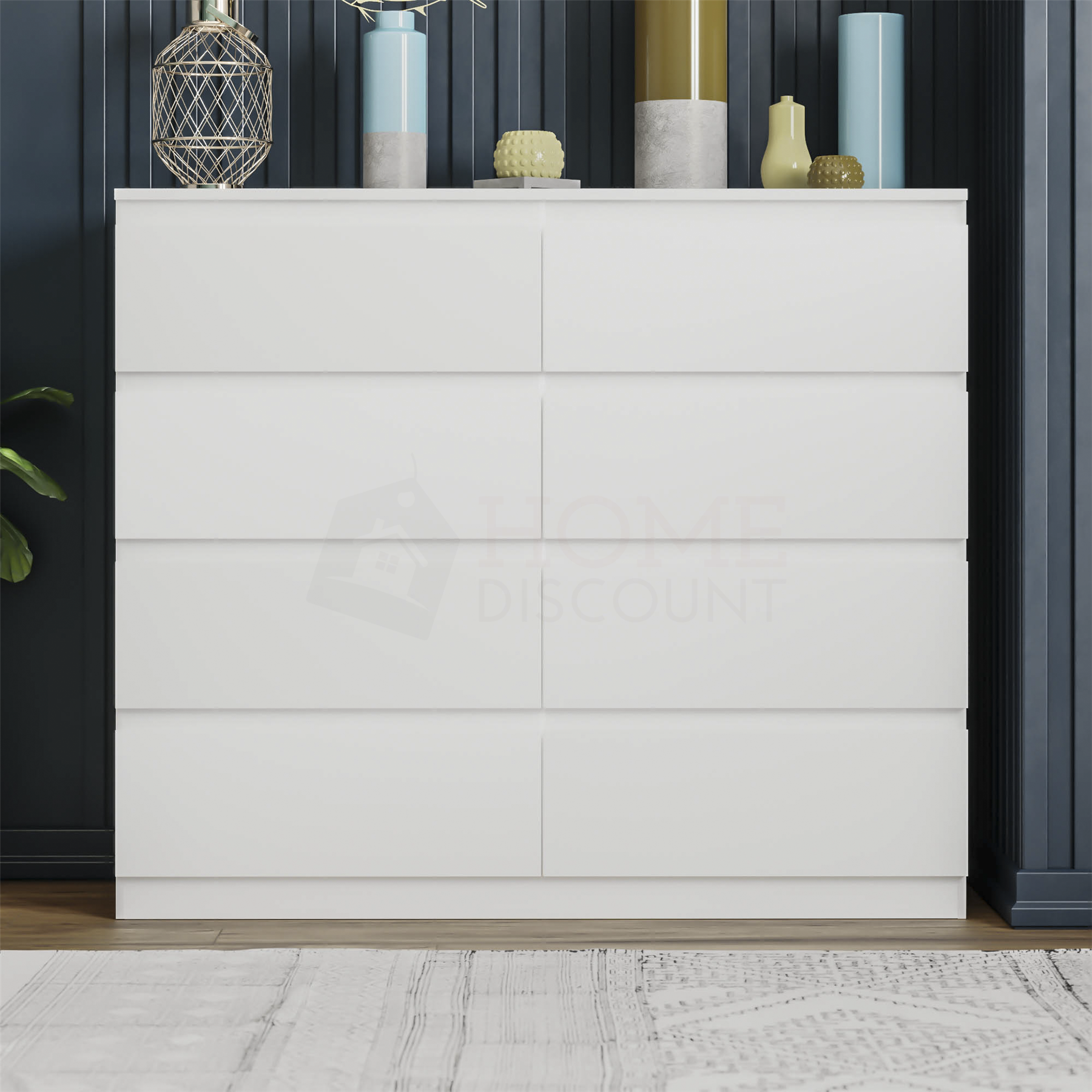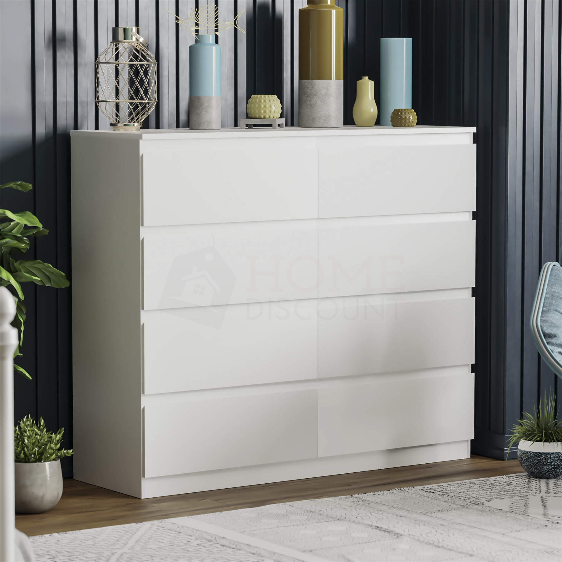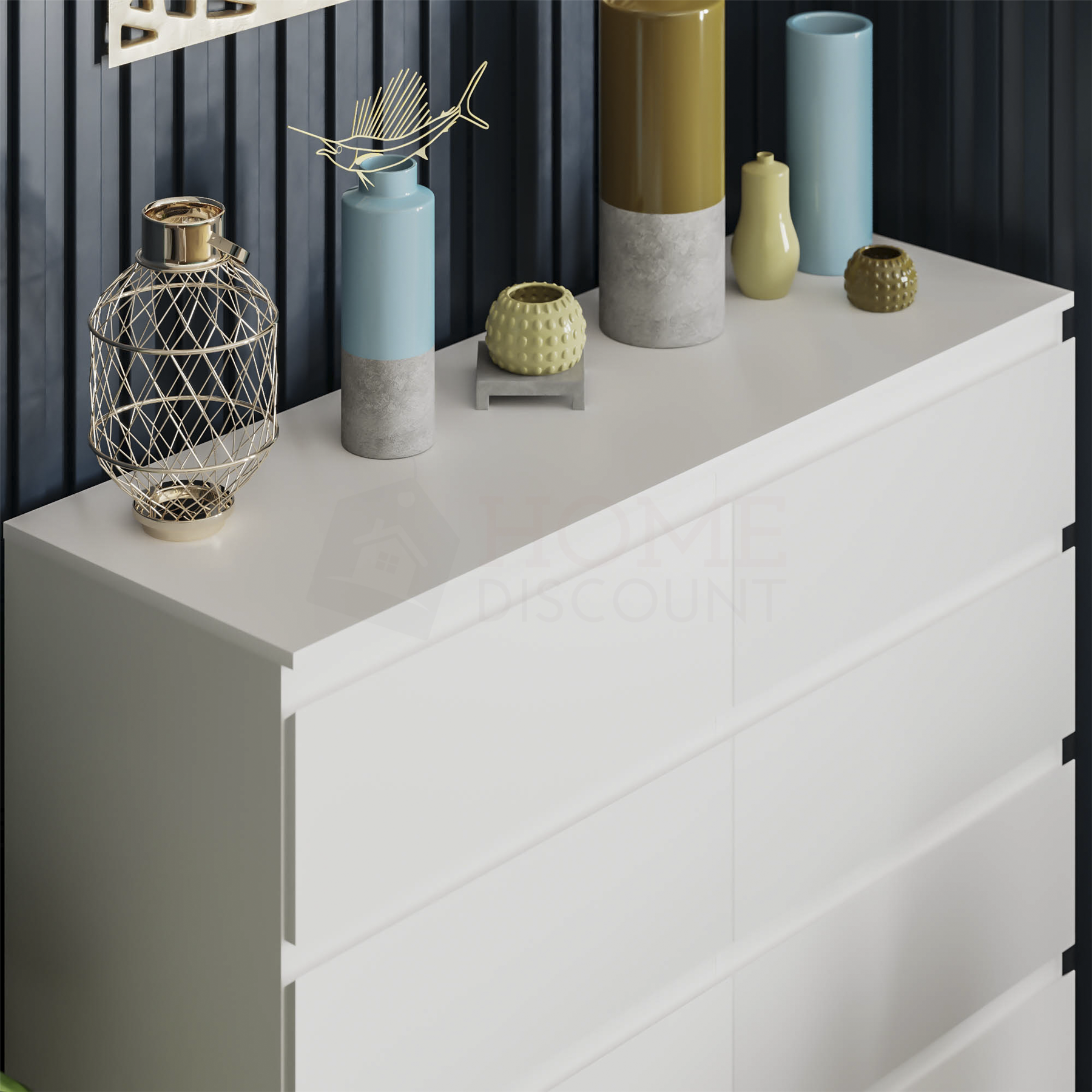 Home Discount offers this stunning new product with a modern stylish design, the Denver 8 Drawer Chest, White. This chest features eight generous drawers where you can store your personal items; wide top that is suitable for placing your favourite decorations, cosmetics, and accessories. Intended for a hassle-free experience, the drawers glide open effortlessly for quick, user-friendly use. Constructed from high quality chipboard and MDF, this solid piece of furniture would look fantastic in any room, regardless of whether it's in your hallway, dining room, living area, or bedroom!