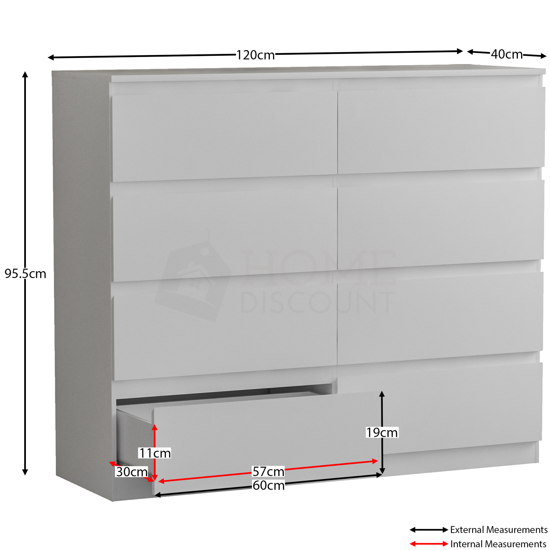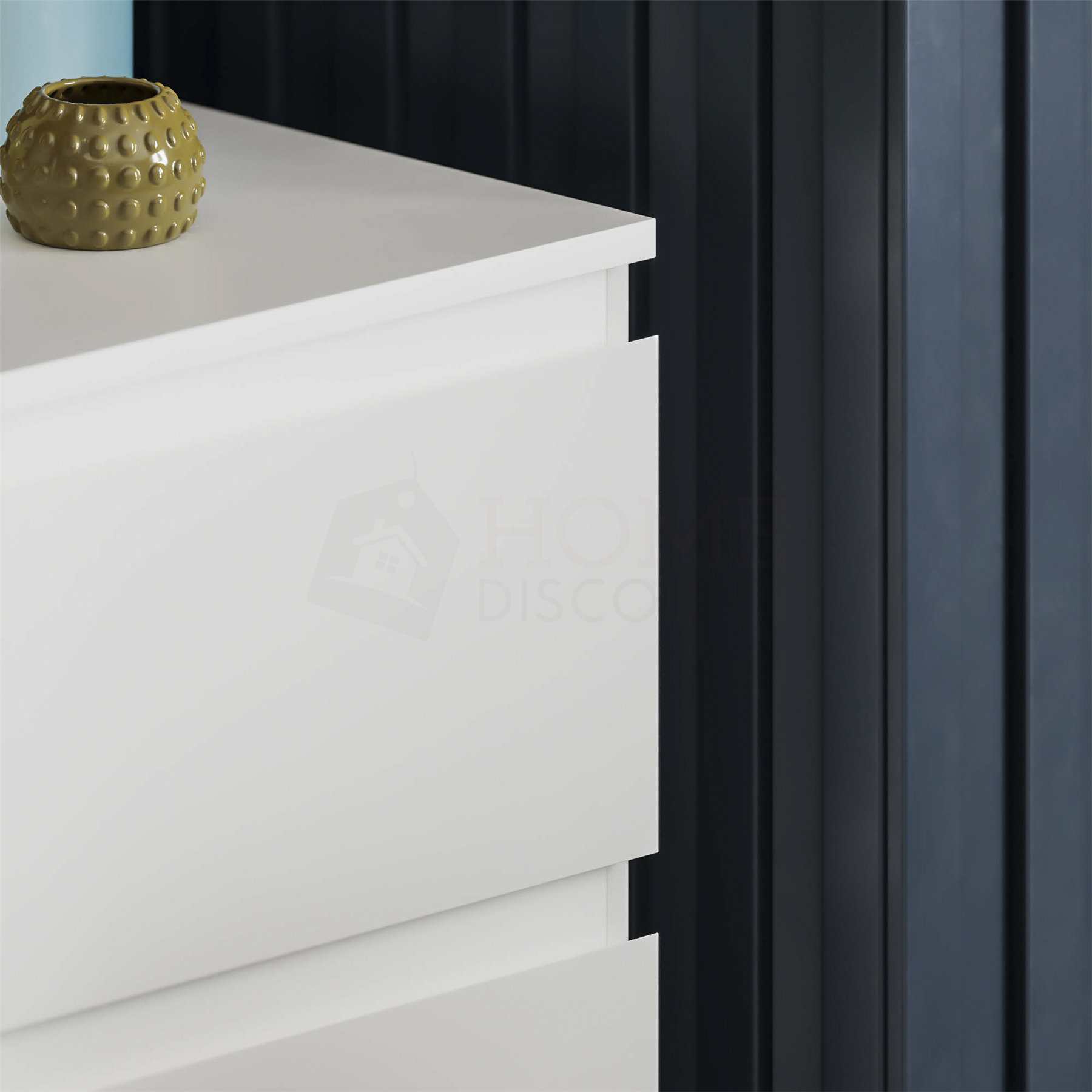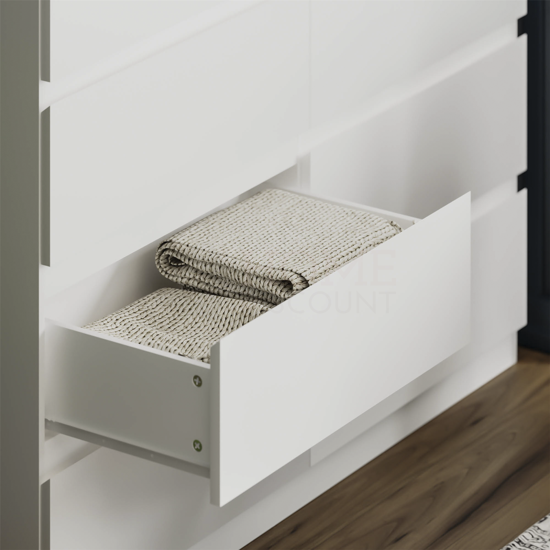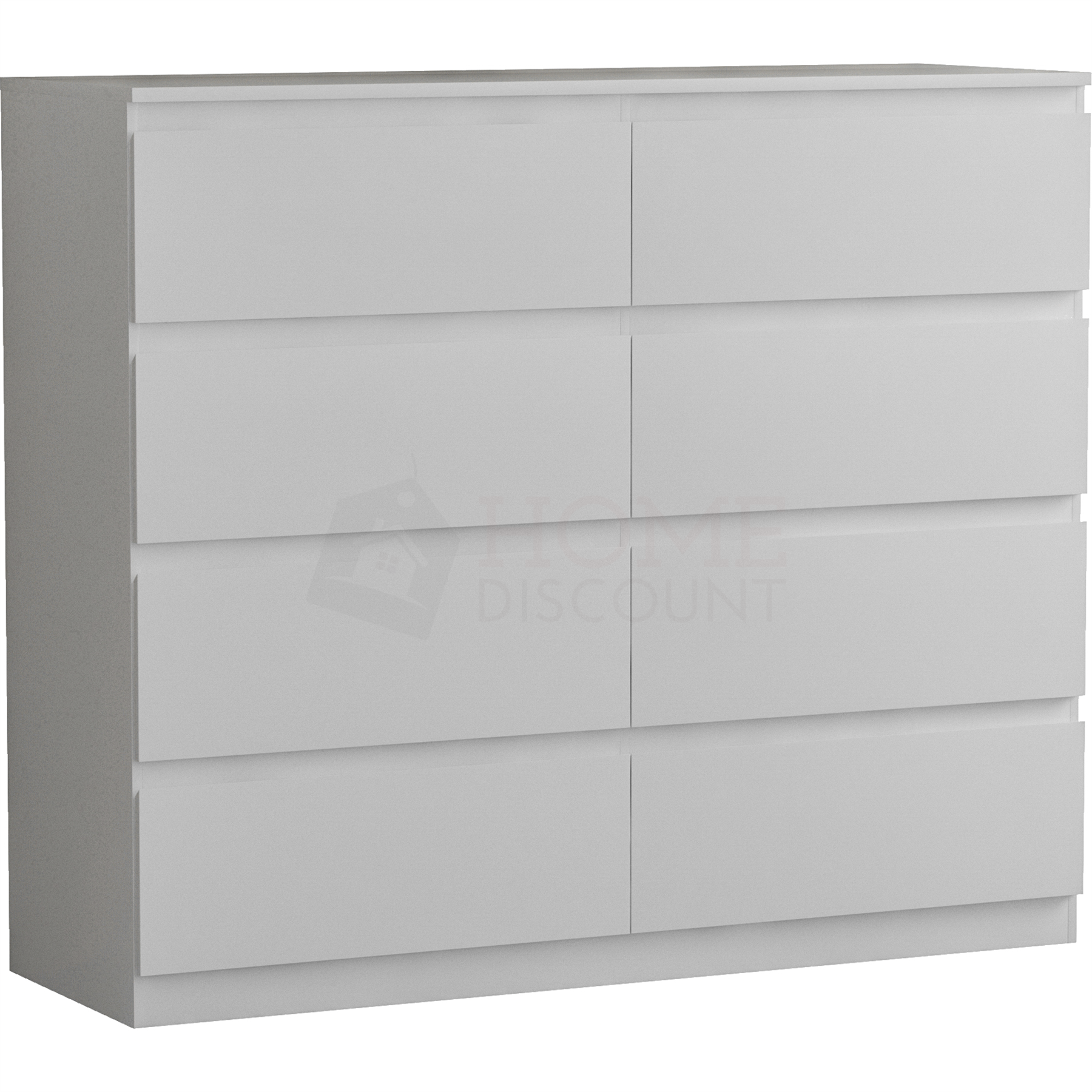 Home Discount offers this stunning new product with a modern stylish design, the Denver 8 Drawer Chest, White. This chest features eight generous drawers where you can store your personal items; wide top that is suitable for placing your favourite decorations, cosmetics, and accessories. Intended for a hassle-free experience, the drawers glide open effortlessly for quick, user-friendly use. Constructed from high quality chipboard and MDF, this solid piece of furniture would look fantastic in any room, regardless of whether it's in your hallway, dining room, living area, or bedroom!