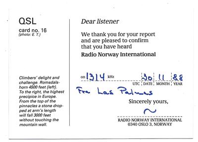 A good QSL-card from Radio Norway International in Oslo, confirming report from Las Palmas on the 30th of November 1988. No pinholes or bent corners. Card no 16. Good radio history.