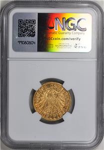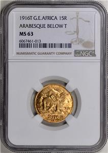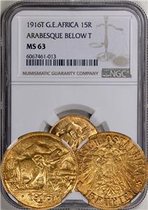 German East Africa - 1916-T Gold 15 Rupien graded by NGC as MS-63. Arabesque below the T in "OSTAFRICA" variety. A coveted German colonial type revered for its use of an elephant in the obverse imagery, a symbol commonly associated with the African continent.