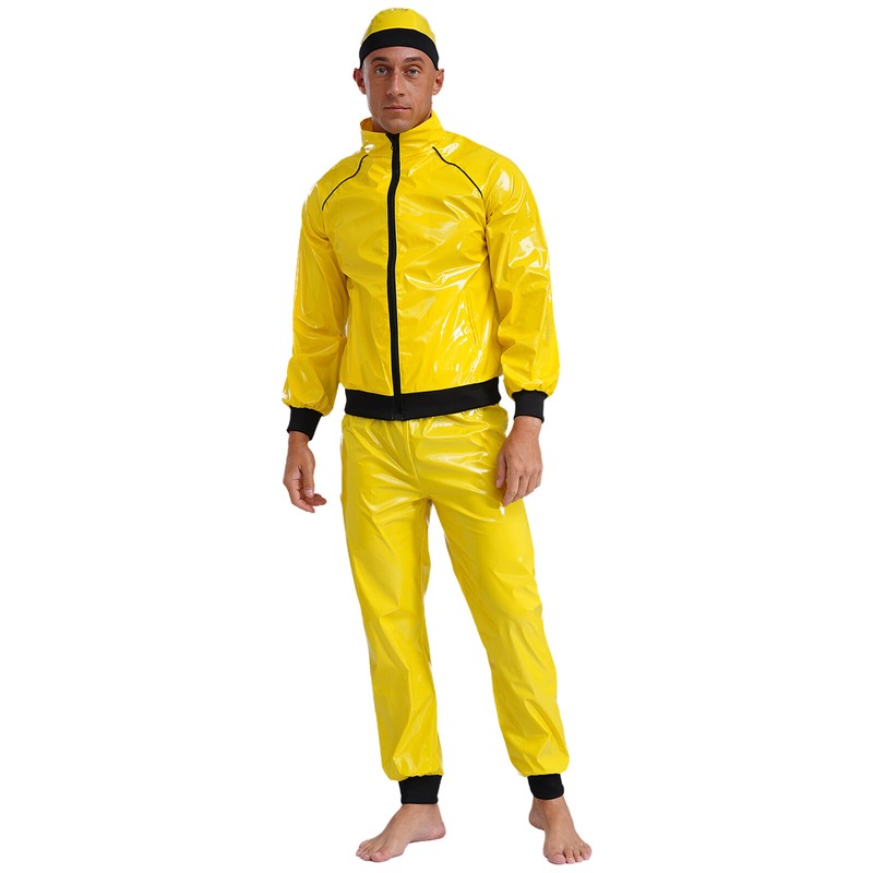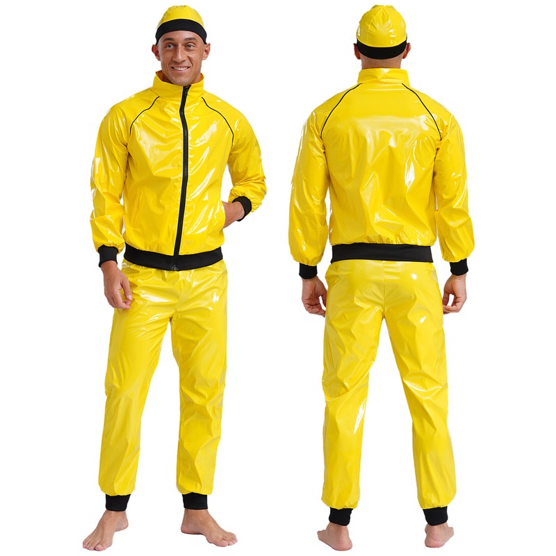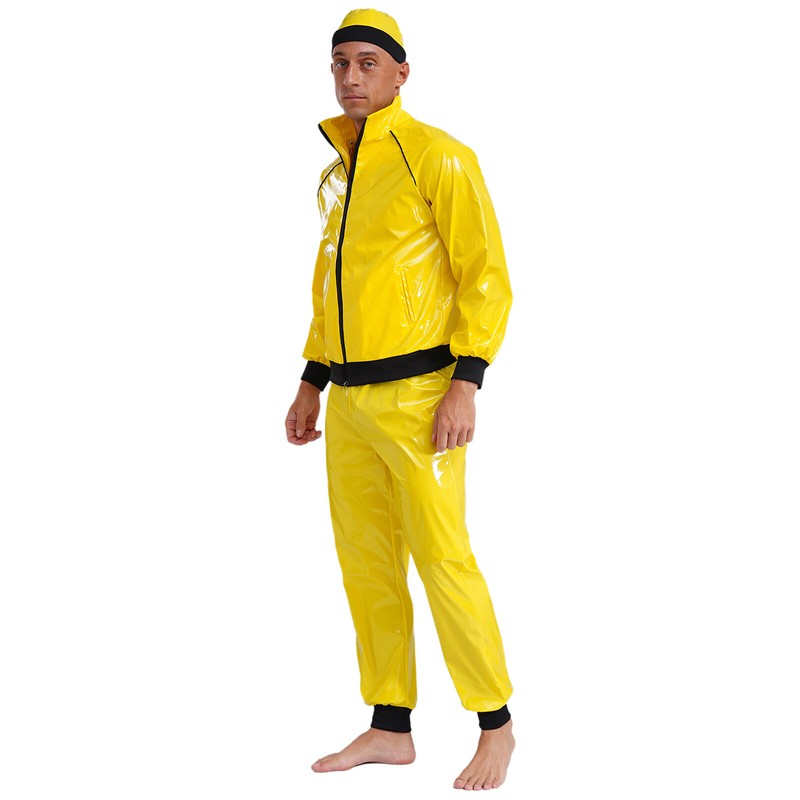Matching with jogging pants and hat. Bright yellow and black colors make you stand out in the crowd, you will be the focus in the party.