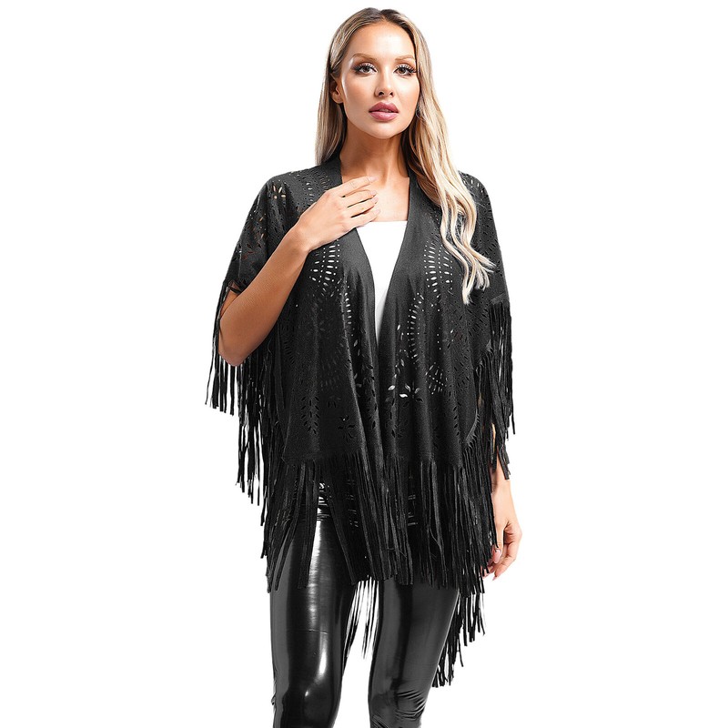 Hollow out faux suede cape for women with asymmetrical tassel makes you look more beautiful and charming.