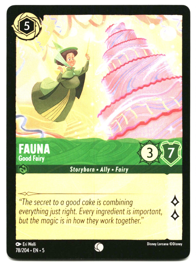 | Description: | Fauna | | Category: | Heroes | | Year: | 2024 | | Product: | Disney Lorcana Trading Card TCG | | Set: | Shimmering Skies | | Card Number: | 78 | | Dimensions: | 3½" x 2½" | | SKU: | SH b0001 R01 G (41) |