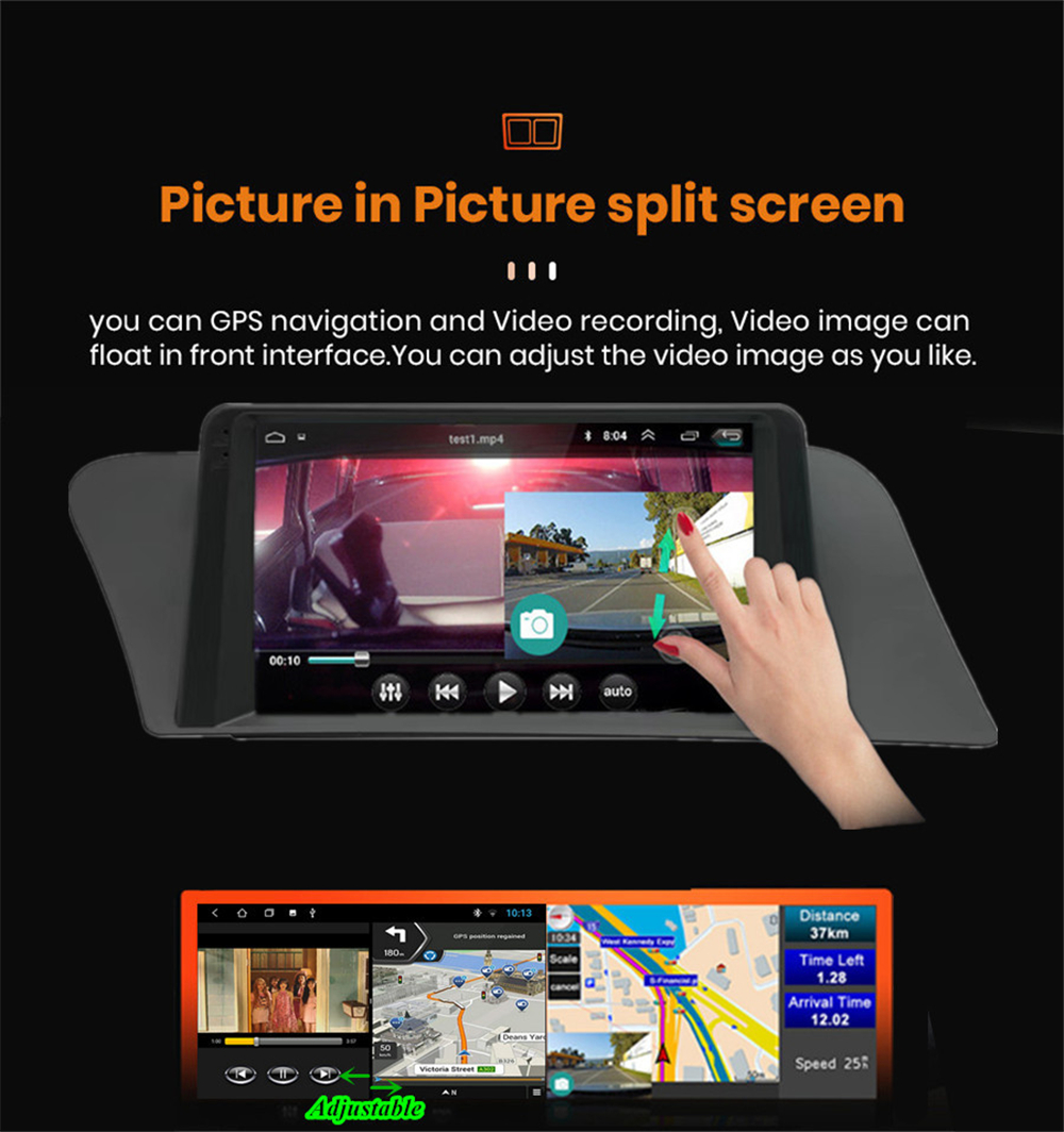 - Change Apps-Icon Position: Yes - Picture in picture split screen:Yes Split screen feature enables you to use two applications at the same time. For example running Navigation with Music Player or Radio with Navigation at the same time. Optimum convenience for both the driver and passengers. |