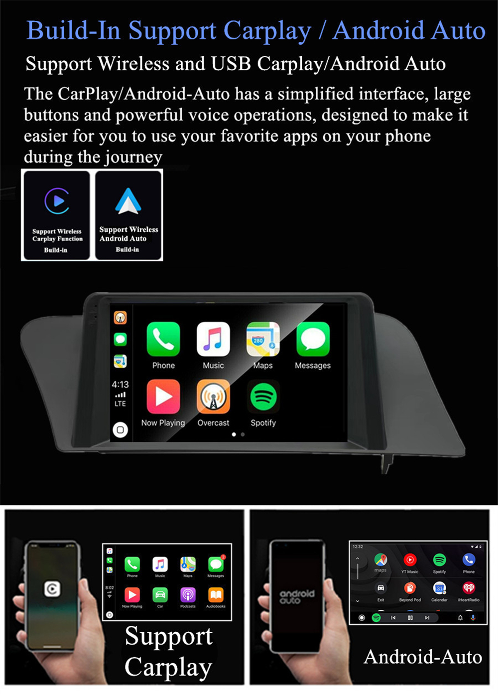 | Support Carplay/Android Auto | -Build-In Support WIFI Wireless & USB Wired Carplay And Android Auto. |