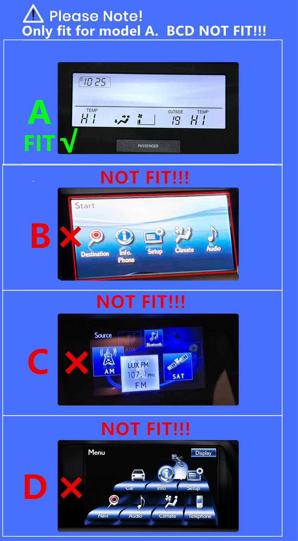 | Only fit for cars with model A central control. B and C and D NOT FIT!!! As shown in the picture.
