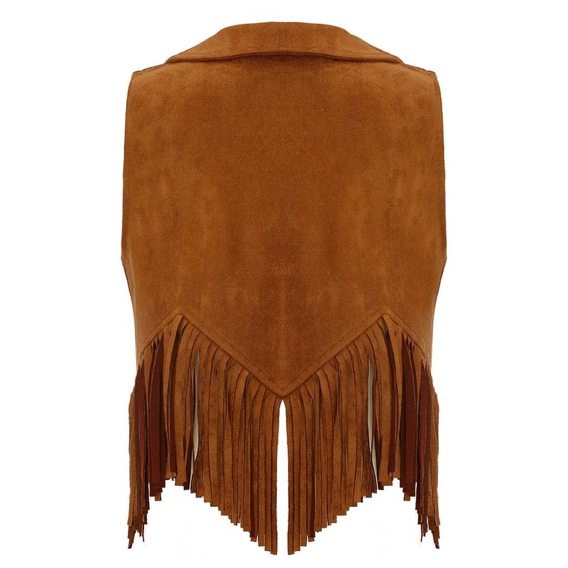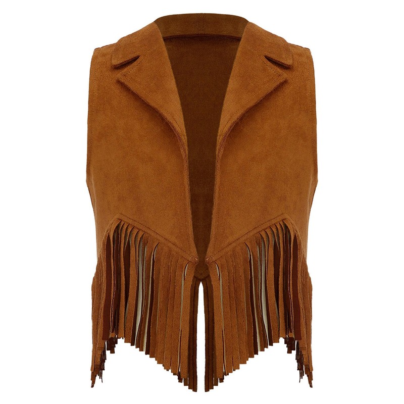 Suede cowgirl vest for girl, designed with lapel collar, open front without button and fringe around bottom.