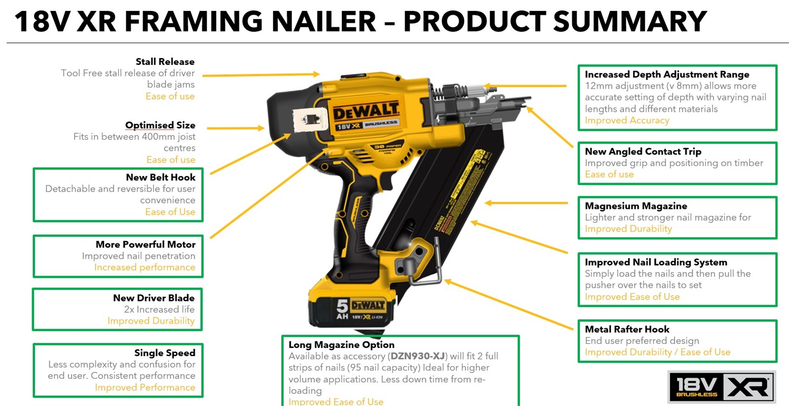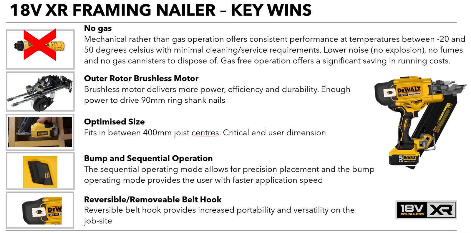 DeWalt XR DCN930N Cordless 18v Brushless 90mm Gasless Framing Nailer 1st Fix