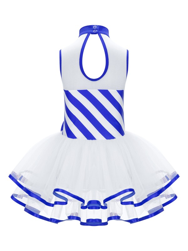 Featuring with striped bodice and tulle skirt, mesh illusion neckline, mock neck with snaps and keyhole back.
