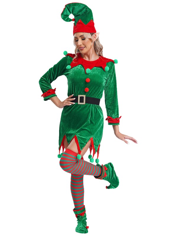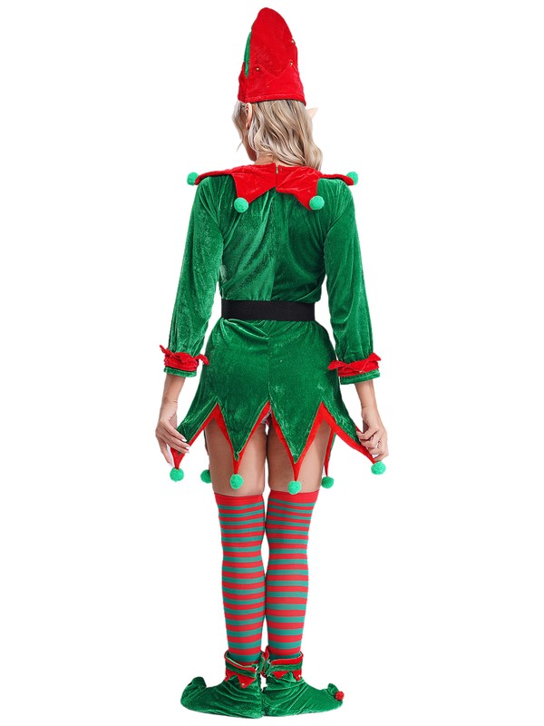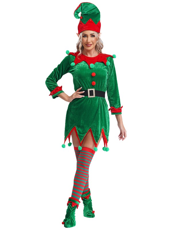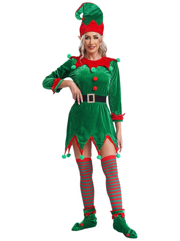 A complete Christmas elf costume set for adult size, includes a hat, a dress, a pair of elf ears, shoes covers and stockings.