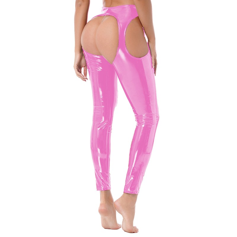 Womens Wet Look High Waist Cutout Leggings Crotchless Open Butt Patent Leather Skinny Pants.
