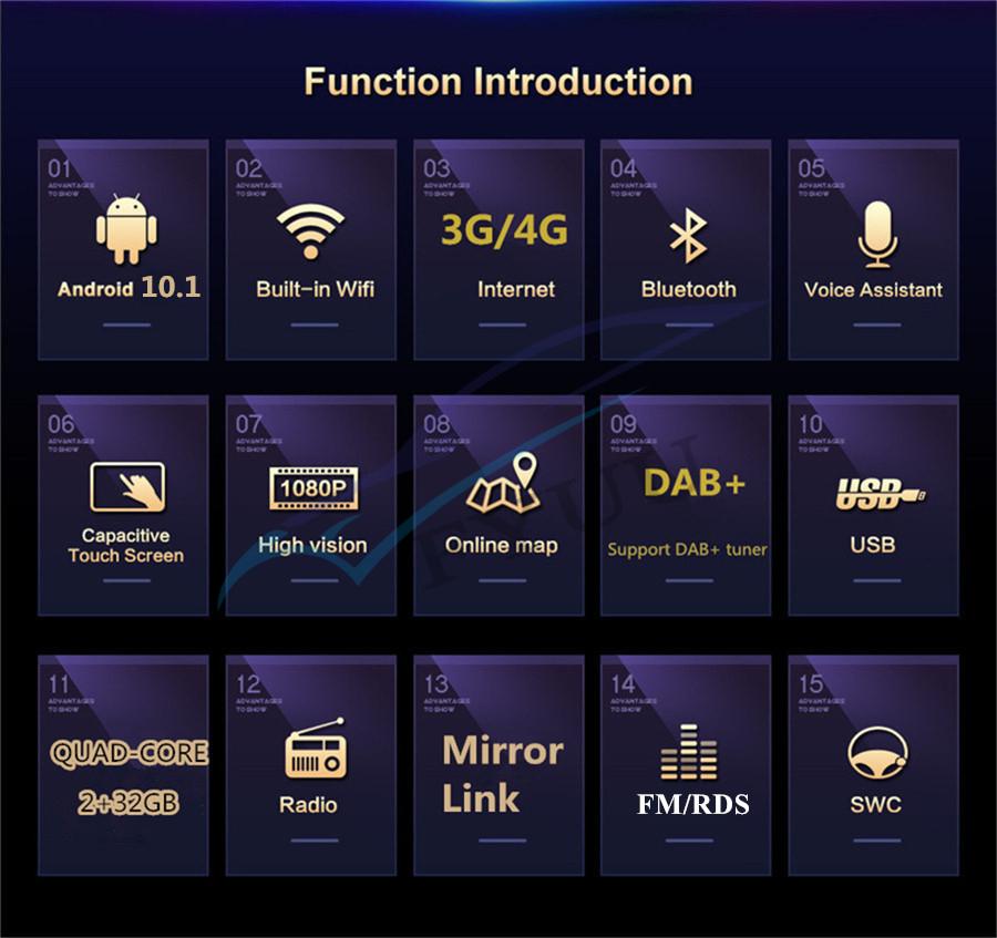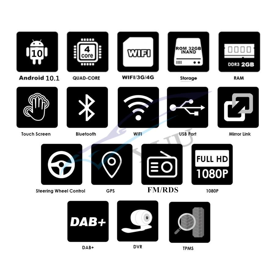 - Textbook: Could change font, font color, background color, bookmark, reading E-book while listening music - Photo Viewer: Support JPS, BMP, PNG, GIF etc. format. play by revolve, Powerpoint Support 4096*4096 Pixels - Wallpapers: 5 live wallpapers, 17 standard wallpapers, support DIY wallpaper from Gallery - APK Installer: Support Android Package installer - Support Torque Pro(OBD2 &Car): Yes, you can connect a Bluetooth OBD2 Scanner Tool to use this function - Support Mirror Link function: Yes, support screen mirroring from iPhone and android smartphone - Support TPMS: YES (Not Included) |