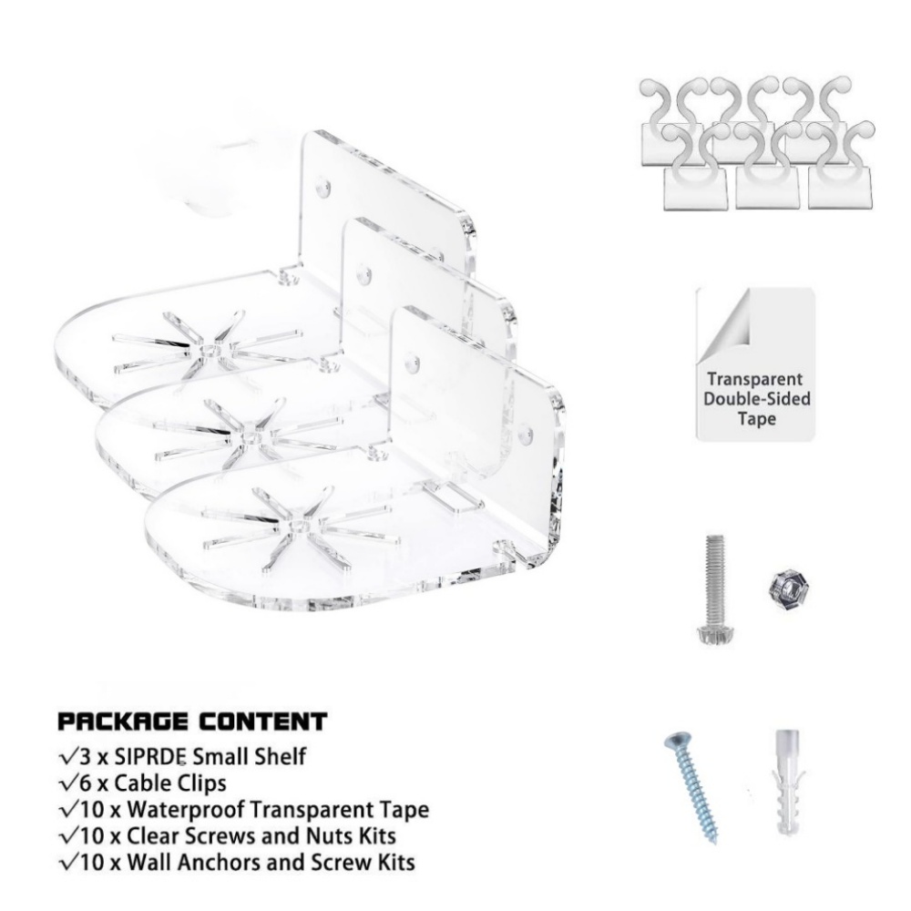 【Multipurpose】3 universal small acrylic shelf, ideal for use with baby monitors, security cameras, small WiFi routers, small speakers, action figures, plants, keys, phones & more.