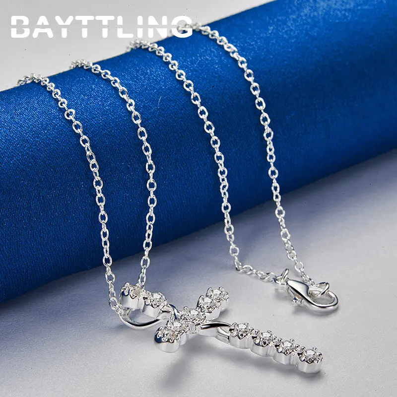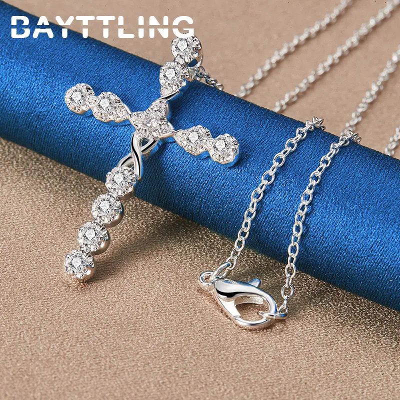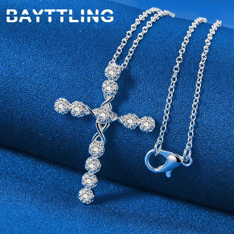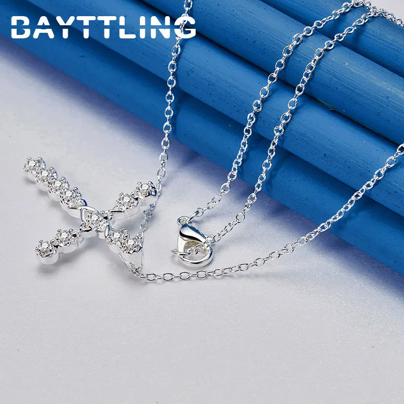 Fine 925 Sterling Silver 16-30 Inches Shiny Cross Zircon Necklace Men Women Fashion Gifts Charm Party Jewelry Wedding