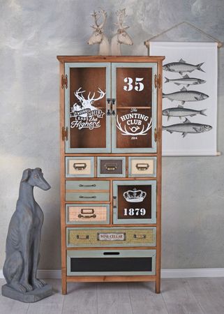 Con cinco cajones y Tres puertas El escaparate ofrece oportunidades versátiles para un almacenamiento elegante de Platos, vasos, libros, decoración o accesorios para el hogar. Los elementos de vidrio aseguran la transparencia y la ligereza, mientras que el individuo aparece Mirada usada con un personaje único generar.