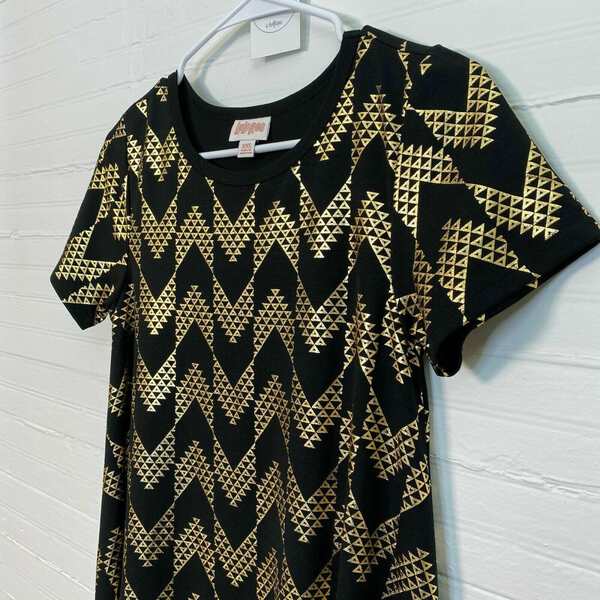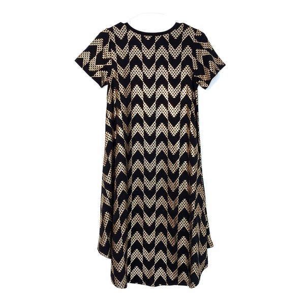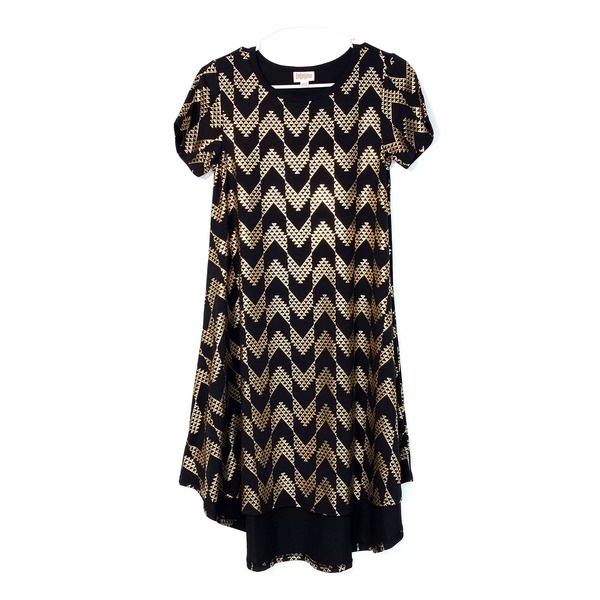 Step into elegance with the stunning LuLaRoe Women Carly Dress in a captivating Black/Gold Chevron pattern. This exquisite shift dress is designed to make you feel confident and stylish, whether you're heading to a casual brunch or a special evening out. Crafted from a soft and breathable polyester blend, this dress drapes beautifully, offering a flattering silhouette that enhances your natural beauty. The short sleeves and high-low hemline add a touch of modern flair, making it a versatile addition to your wardrobe.