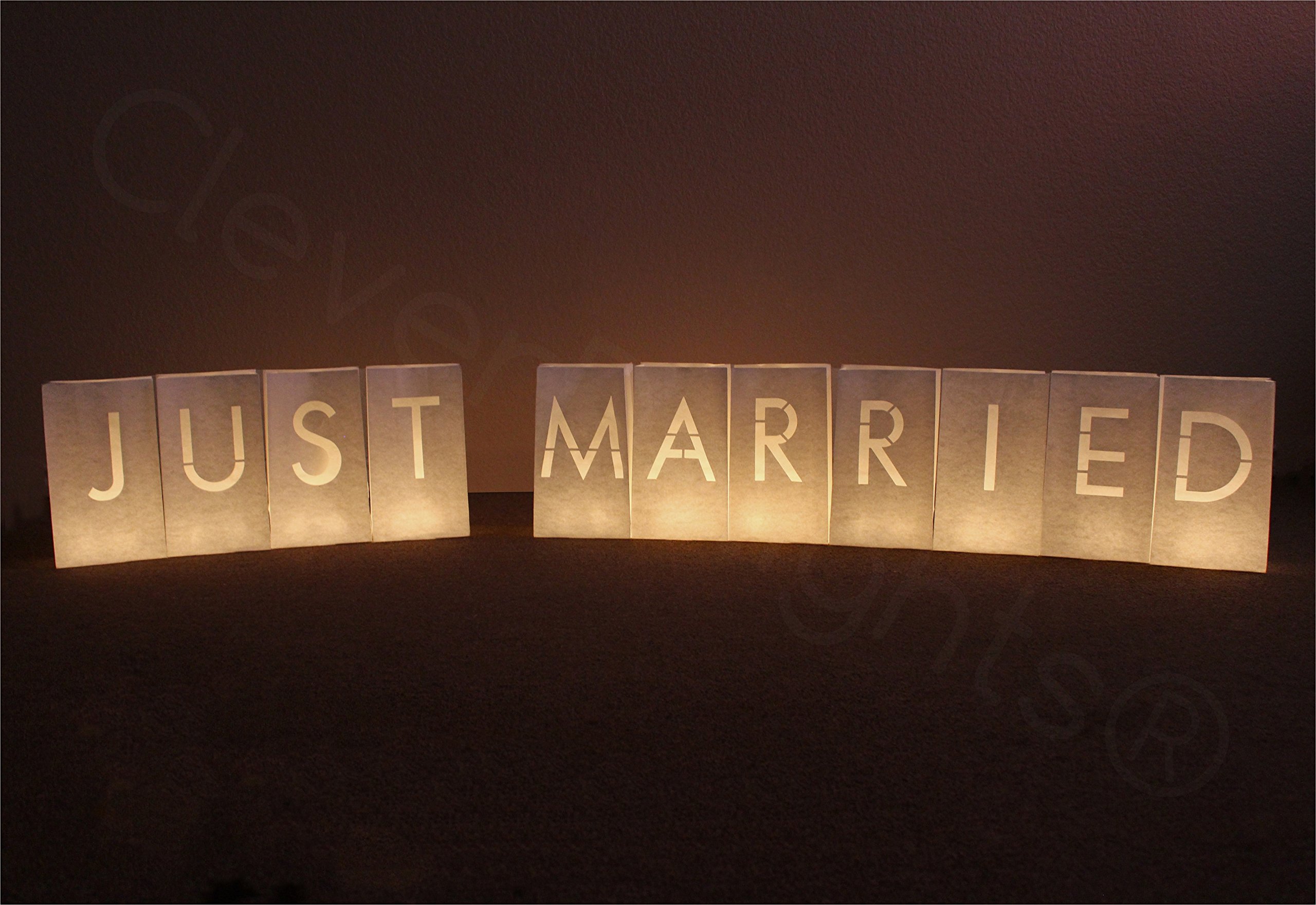 Add some candle-lit decor to your wedding or wedding reception with these "Just Married" white luminary bags. Tip for outdoor use: add a small amount of sand or rocks to the bottom of each bag so they don't tip over in the wind.