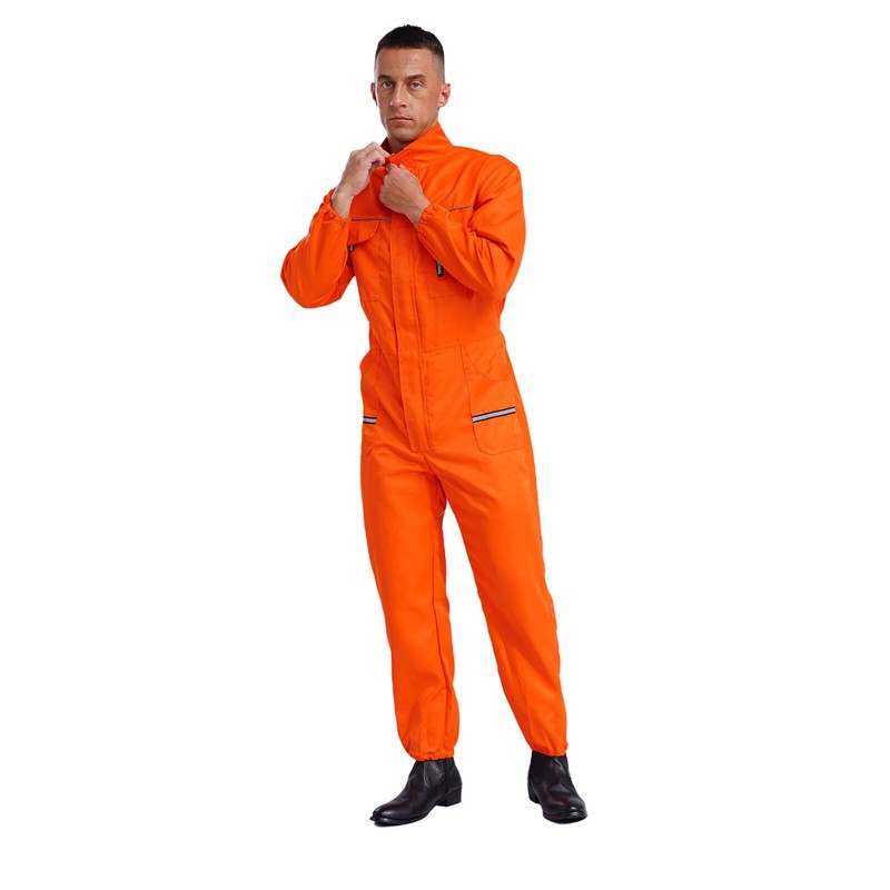 Unisex work jumpsuit fits for women and men, designs with stand collar, front zipper, elastic opening, multiple pockets, reflective stripes.