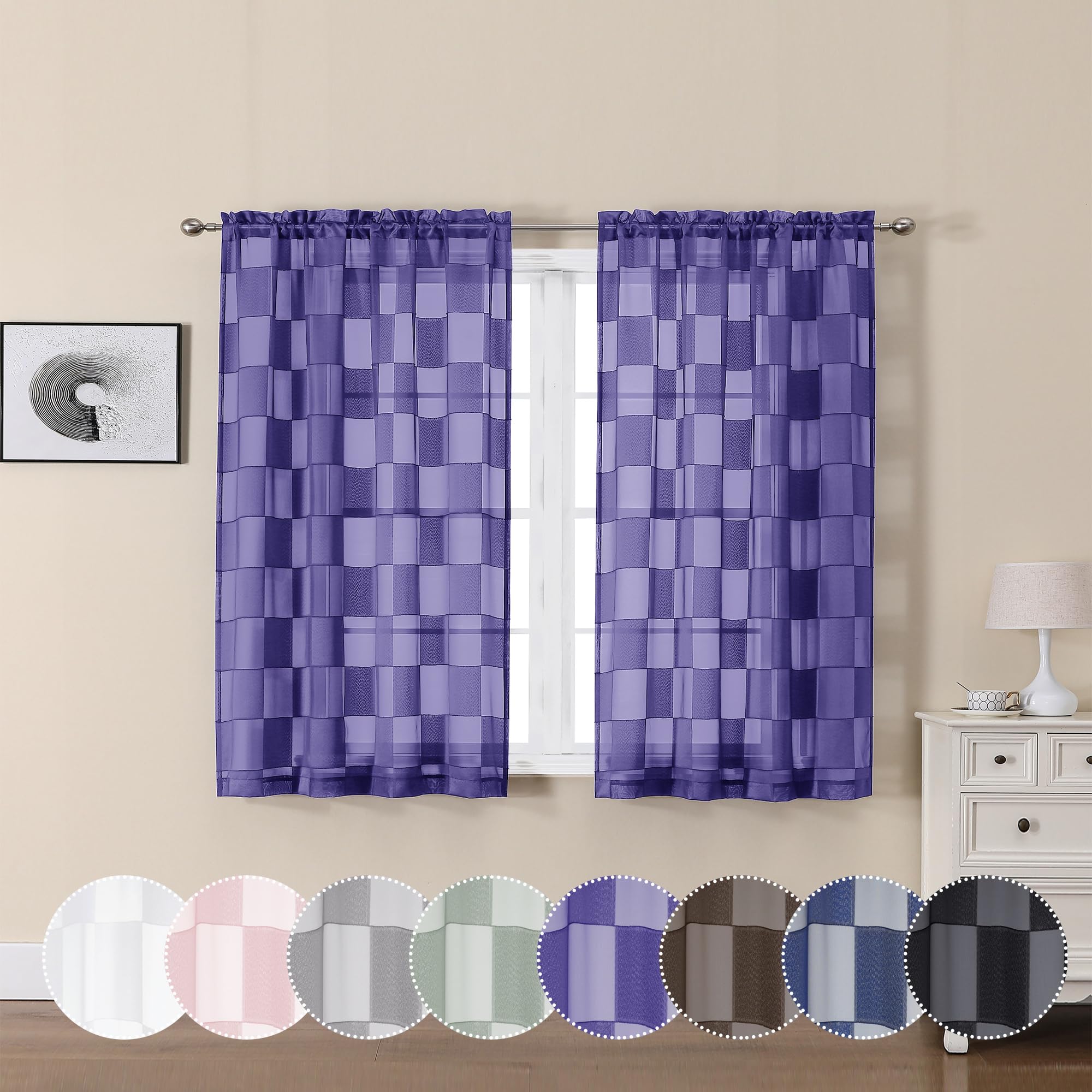 【Light Filtering Sheer Curtains】 Semi checkered sheer not only appears an elegant look without wrinkle but also adds a soft touch. The 45 inch sheer curtains can softly filter out glare sunlight and offer just the right amount of privacy.