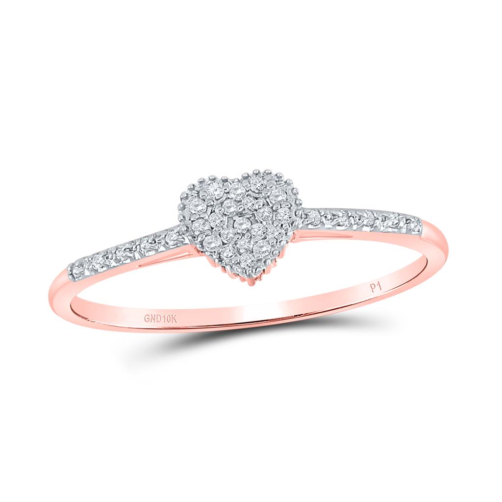 This exquisite diamond Heart Band Ring, casted in 10k Rose Gold. Radiant with 0.05 ct. t.w. of Round cut diamonds and high polished to a bright lustrous shine. This statement ring will sparkle for a lifetime, a look she'll always treasure. Diamonds are Prong set in-between the Rose Gold mounting to securely fasten the diamonds. The diamonds are hand set precisely to give it a smooth uniform flow. Solid mounting, the ring weighs approx. 1.07 gr. All diamonds in this ring are matching in clarity and color. Currently this ring is ladies size 7, if you would like this ring in a different size please message us, for resizing charges and we will get back to you right away. This ring can be sized at your local jeweler as well.
