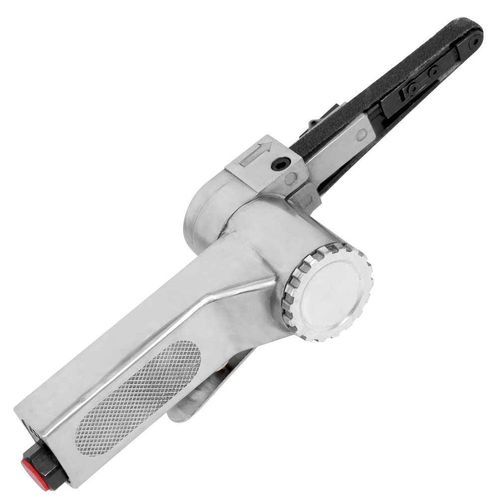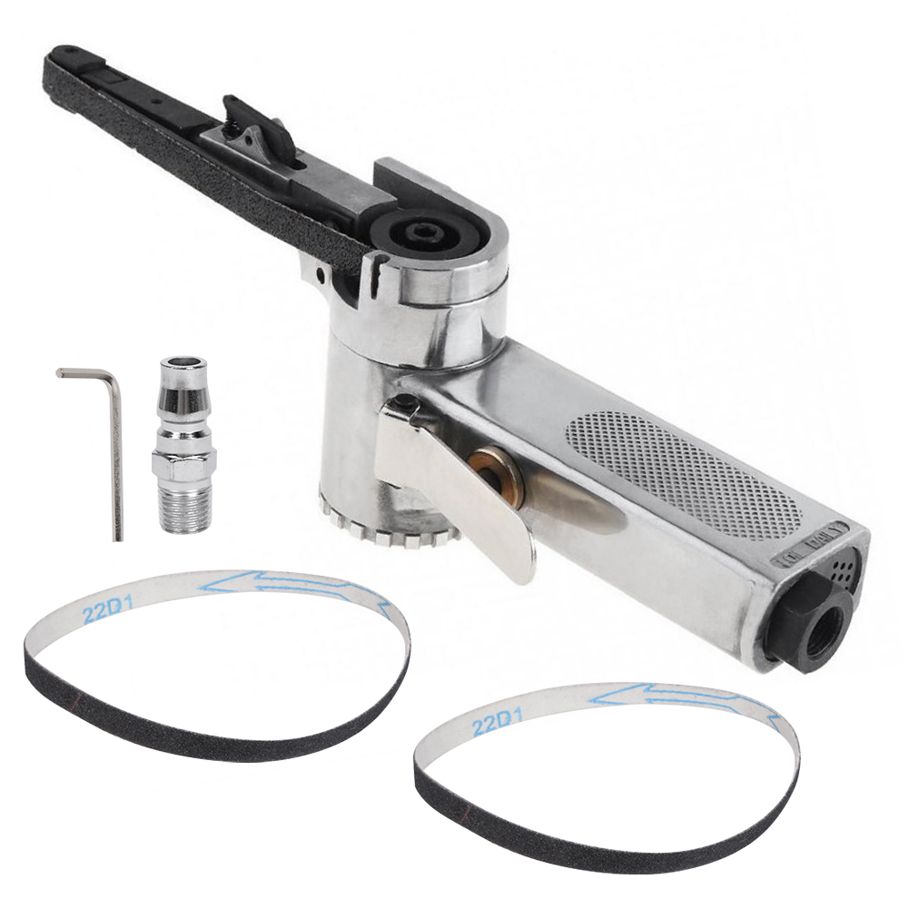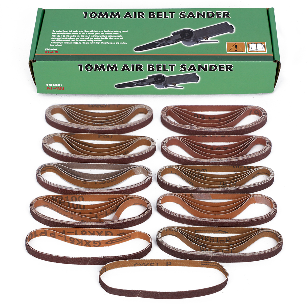 Package Contents: 1* polishing machine 50pcs Set belts Features: * Brand new and high quality *Made of high quality material, more durable. *Suitable for all grinding work, including woodworking / furniture polishing / plastic / aluminum and all forms of metal polishing *Soft and durable alumina and abrasive belt *Closed sand spacing and hard backing *All resin bonding for all portable machines Specifications: *Color: As Pictures Show *Grit:60(14pcs),80(12pcs),100(12pcs),120(12pcs) *Free speed: 16000 rpm *Air inlet -1/4" BSP *Air consumption 6-8 cfm *Working pressure - 90 psi *Dimension: (Approx.) Belt size : 330mm x 10mm Sander width : 10mm Note:The real color of the item may be slightly different from the pictures shown on website caused by many factors such as brightness of your monitor and light brightness.