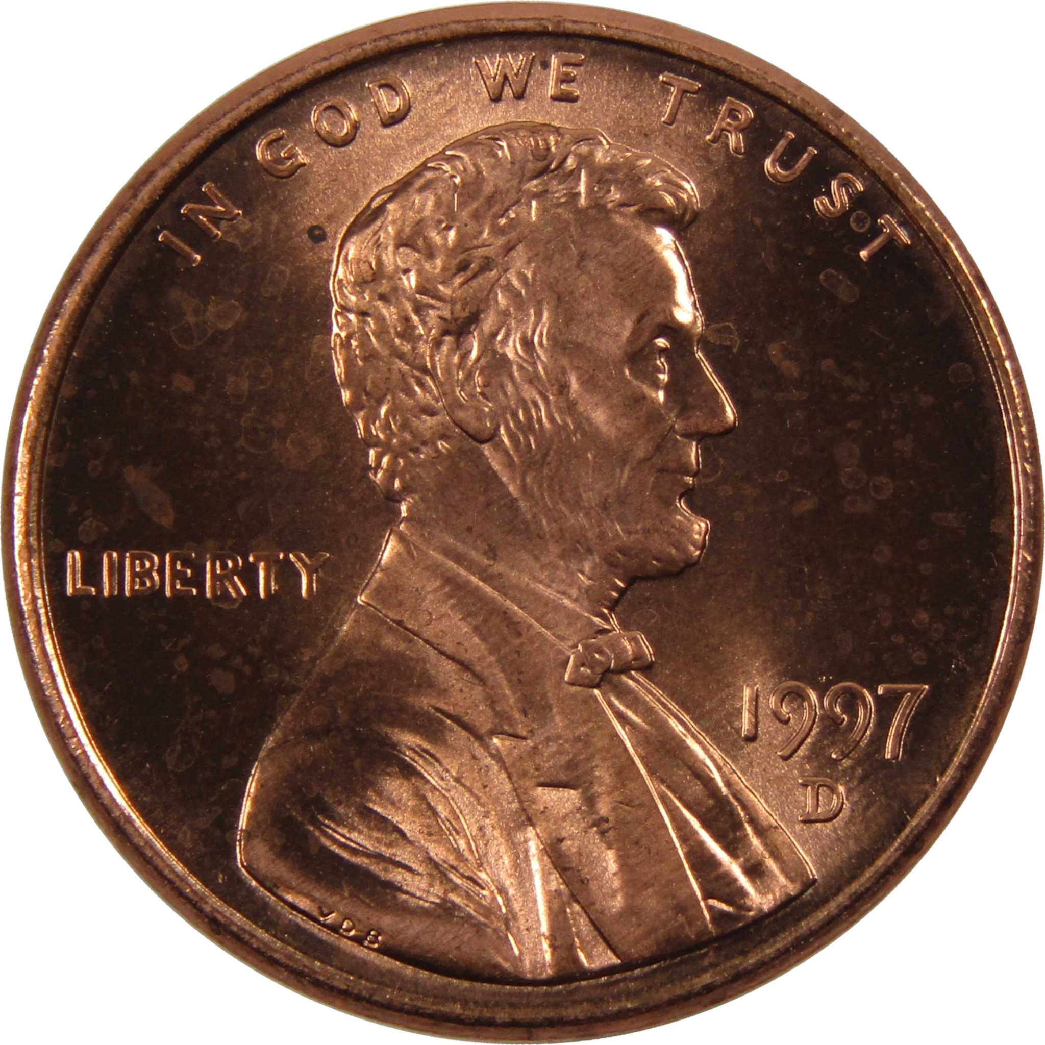 A genuine 1997 D Lincoln Memorial Cent Penny Coin, in BU Uncirculated Mint State Condition