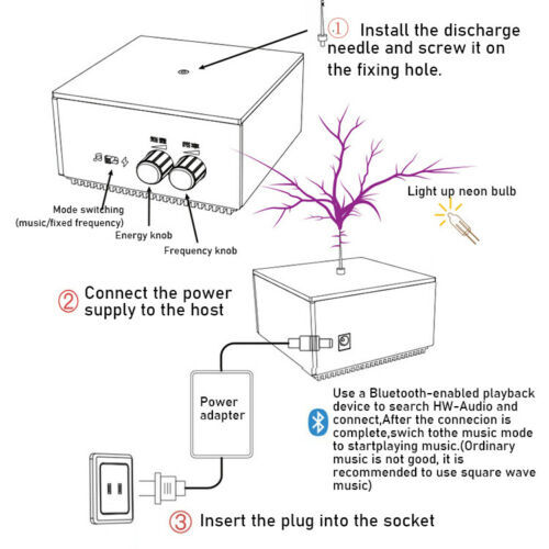 【Precautions for use】1 It is not suitable for people with electronic medical equipment. 2 Do not touch the Tesla while working. 3 Please do not use this Tesla in an environment with flammable and explosive materials or closed coils and large-sized metals. 4 Rotate the sound slowly so as not to be overwhelmed by the arcing sound. Before powering on, be sure to turn the 2 knobs all the way counter-clockwise, so as not to scare you with a sudden sound.