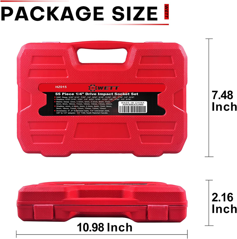1/4" Socket Wrench Set: SAE: Deep: 5/32",3/16", 7/32", 1/4", 9/32", 5/16", 11/32", 3/8", 7/16", 1/2", 9/16". Shallow: 5/32",3/16", 7/32", 1/4", 9/32", 5/16", 11/32", 3/8", 7/16", 1/2", 9/16"