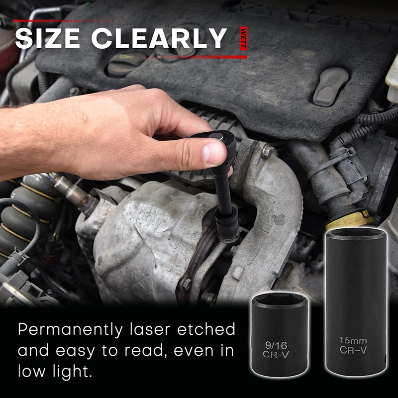 【Size Clearly】 Each metric standard socket in this set is permanently laser-etched with easy-to-read size markings. This feature allows for quick and effortless identification, even in low-light conditions, ensuring efficient work