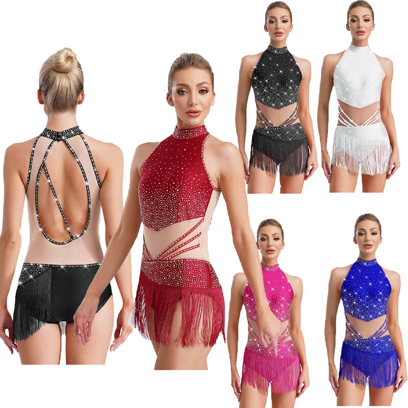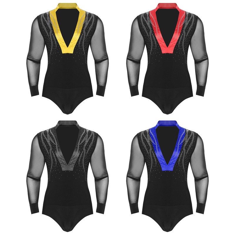 Round neck long sleeve dance jumpsuit with a half of asymmetrical drape skirt with flowy design shows the beauty of dance.