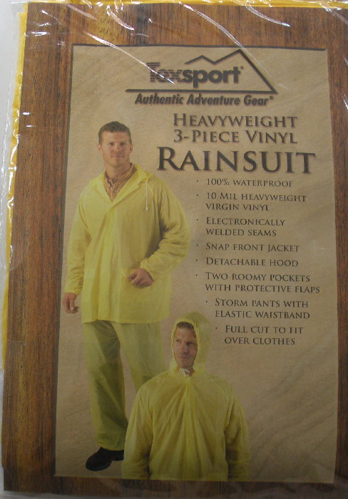 Texsport 33273 3 piece vinyl rainsuit 100% waterproof Heavyweight virgin vinyl Electronically welded seams Snap front parka Detachable hood Two roomy pockets with protective flaps Storm pants with elastic waistband Full cut to fit over clothes Yellow Size Large |