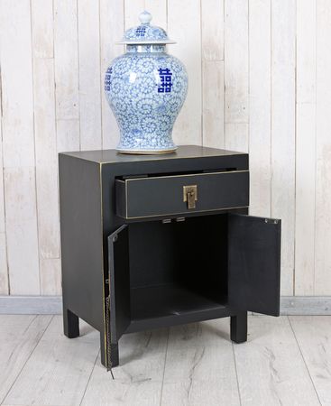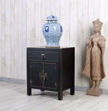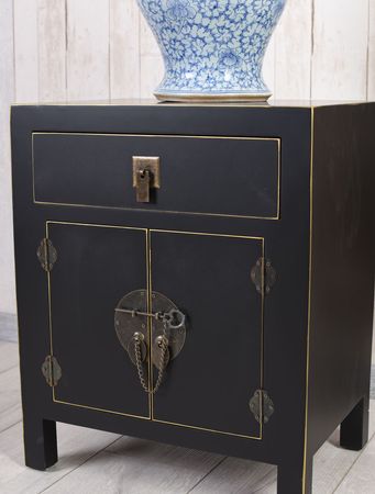 Immergiti nell'affascinante mondo della cultura residenziale dell'Estremo Oriente con il nostro gabinetto della notte cinese "Madame Butterfly". Ispirato allo stile Ming senza tempo, questo mobile ispira con il suo design ridotto e lineare e i bordi discretamente rivestiti di colore. Realizzato in legno e MDF, l'armadio convince con la sua lavorazione di alta qualità e la superficie elegantemente nera.