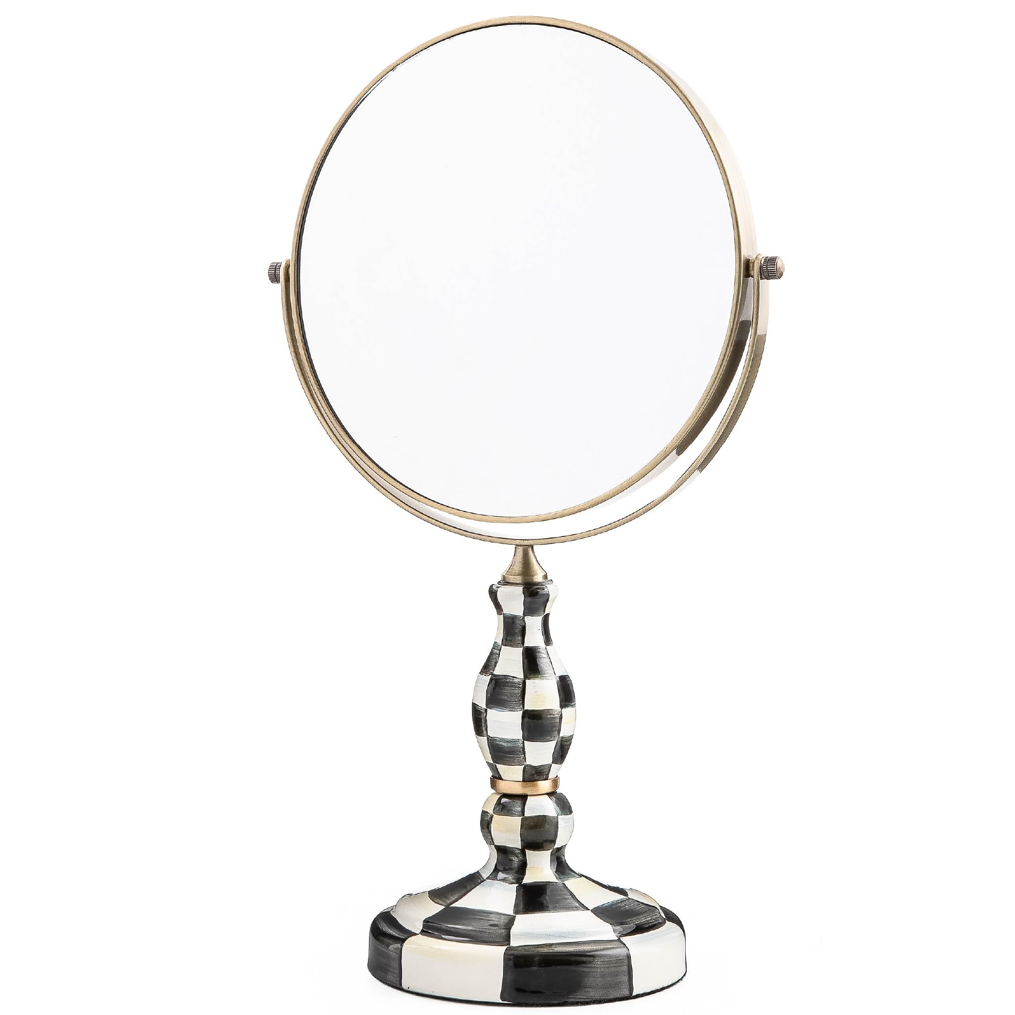 Add style to any space with a MacKenzie-Childs swivel vanity mirror! This round double-sided bathroom counter mirror features our signature pattern for a classic look and has 5x magnification on one side. It's perfect for cosmetic application and facial routines and adds a touch of MacKenzie-Childs charm to your vanity table, dresser, or bathroom counter. Use it by itself or pair it with other MacKenzie-Childs decor to craft your perfect bathroom, office desk, or bedroom space. Take a peek at the rest of our patterned home decor collections to create a magnificent MacKenzie-Childs menagerie!