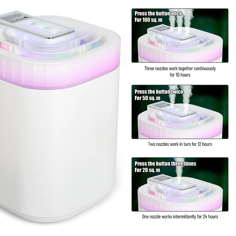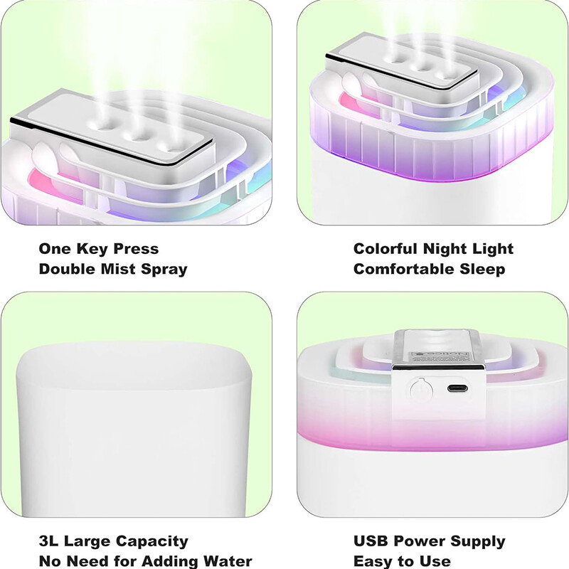 Three Nozzle Humidifier: The cool mist humidifier has a 3L large capacity which keeps your room humidifier running for up to 24 hours. This three-end spray humidifier can make your skin stay young and relaxed, reducing the chance of skin problems and creating a good living and sleeping environment for your large room, bedroom, etc.