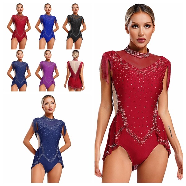 Women Rhinestone Jumpsuit Figure Skating Bodysuit Long Sleeve Gymnastic Leotard