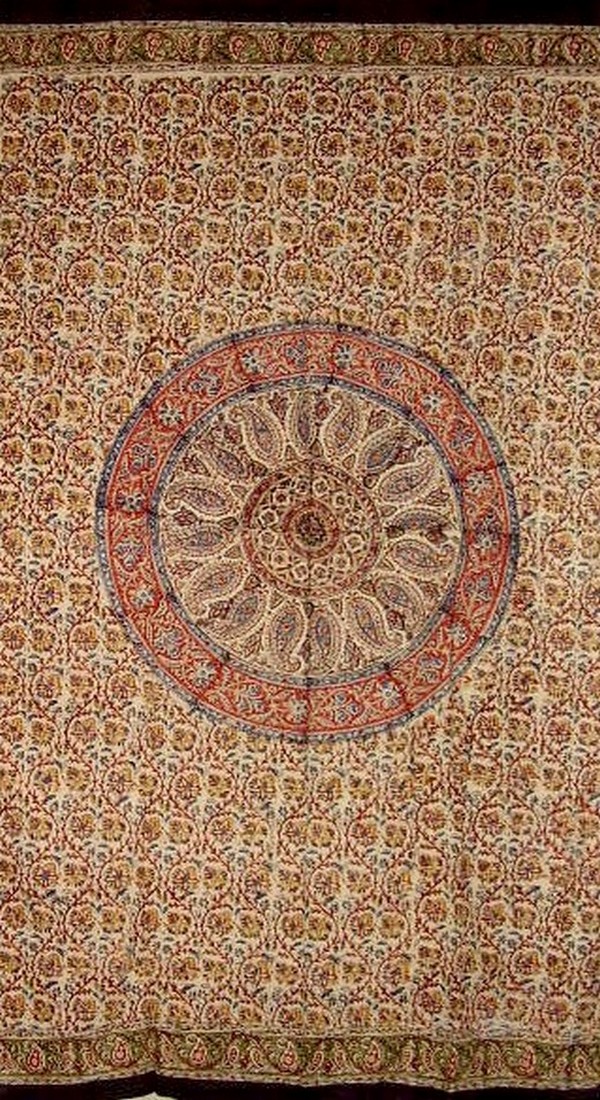 BLOCK PRINT CURTAIN PANEL - Authentic hand block printed Kalamkari curtain panel. Panel measures approximately 46 inches wide x 88 inches long and has a 2 inch rod pocket. Made of 100% quality power-loom cotton offering a smooth tight weave. Mandala circle pattern in indigo blue, gold, crimson red and olive green on tannish background. All panels are sold individually, duplicates are available. They are colorfast, pre-shrunk and can be machine washed on cool/gentle and tumble dried. Kalamkari is a combination of hand painting and block printing. The art of Kalamkari demands a lot of treatment before and after the painting and block printing is completed on the cotton fabric. Hence Kalamkari is a laborious and time consuming process. The Masulipatnam style of Kalamkari usually has delicate Persian motifs like trees, creepers, flowers and leaves. There's a definite Dutch influence which may be traced back to the nineteenth century when there was great demand for Kalamkari from Europe. Today, Kalamkari is still practiced by a number of small families in and around the old fishing port of Masulipatnam, Andhra Pradesh in India. The intricate designs, elaborate borders and understanding of balanced composition have made Kalamkari one of the most desirable styles of Indian printing. Many of our panels have matching tapestry - spreads to match for a great ensemble.