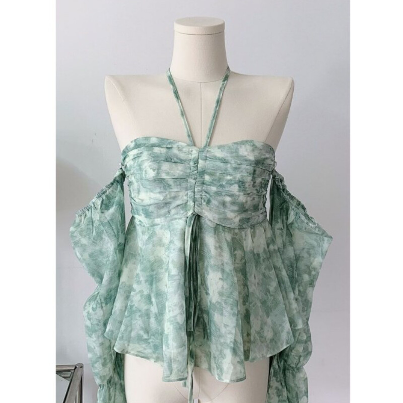 Chemisier en mousseline de soie pour femme, épaules dénudées, volants, manches évasées, plissé, haut à volants, nouveau